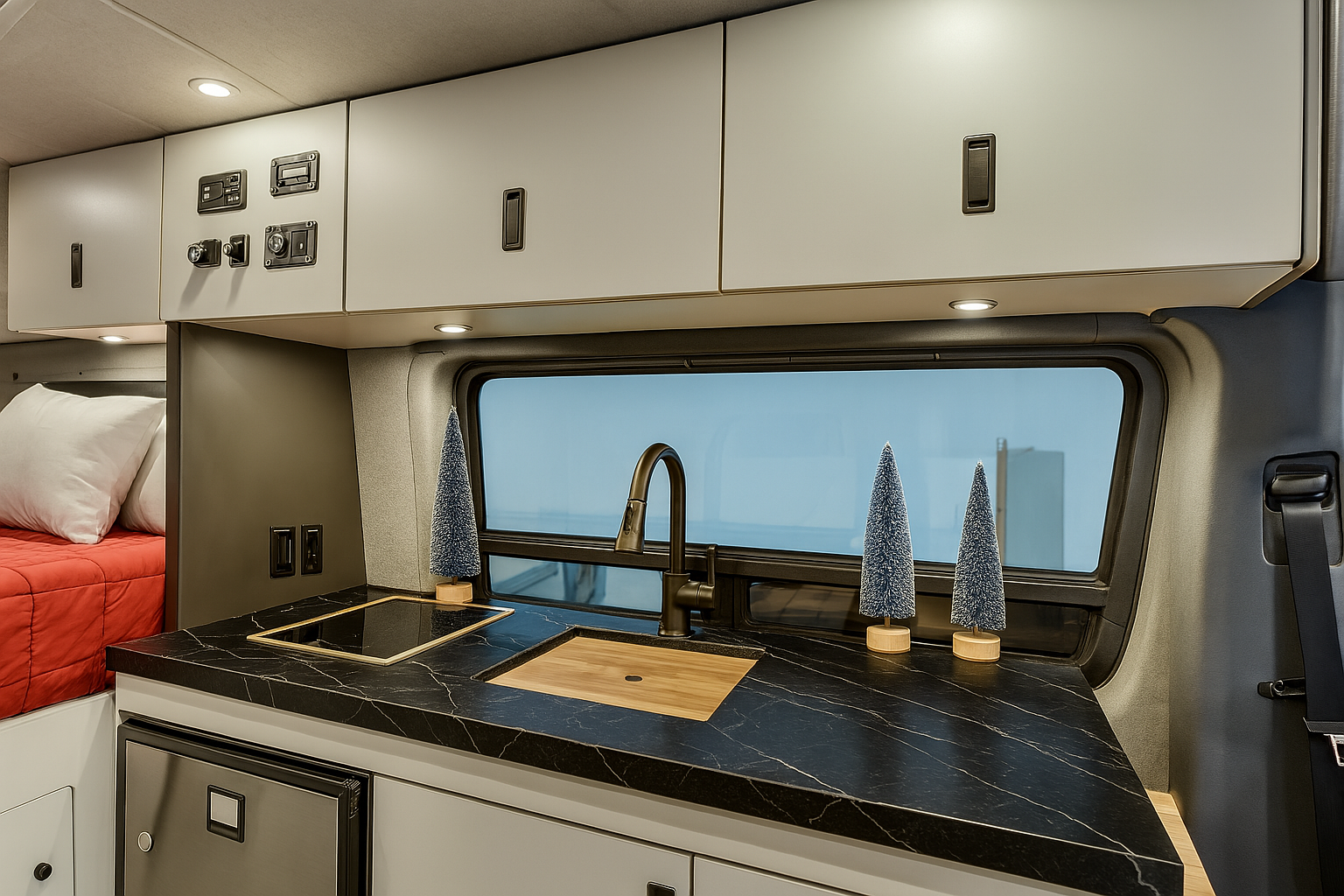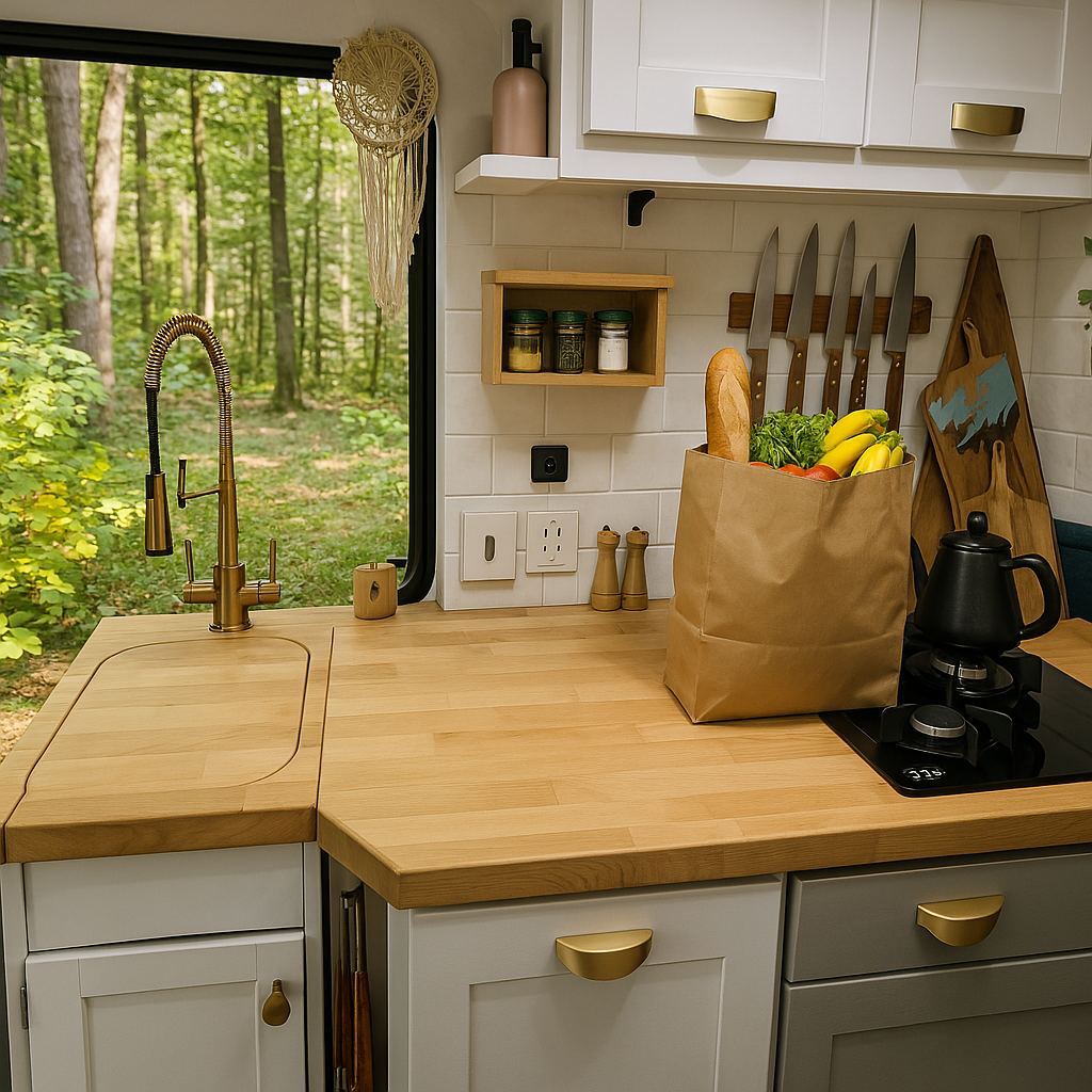 | Kitchen Setup | Simple cooler setup | Sink + 12V fridge | Full galley w/ cooktop |